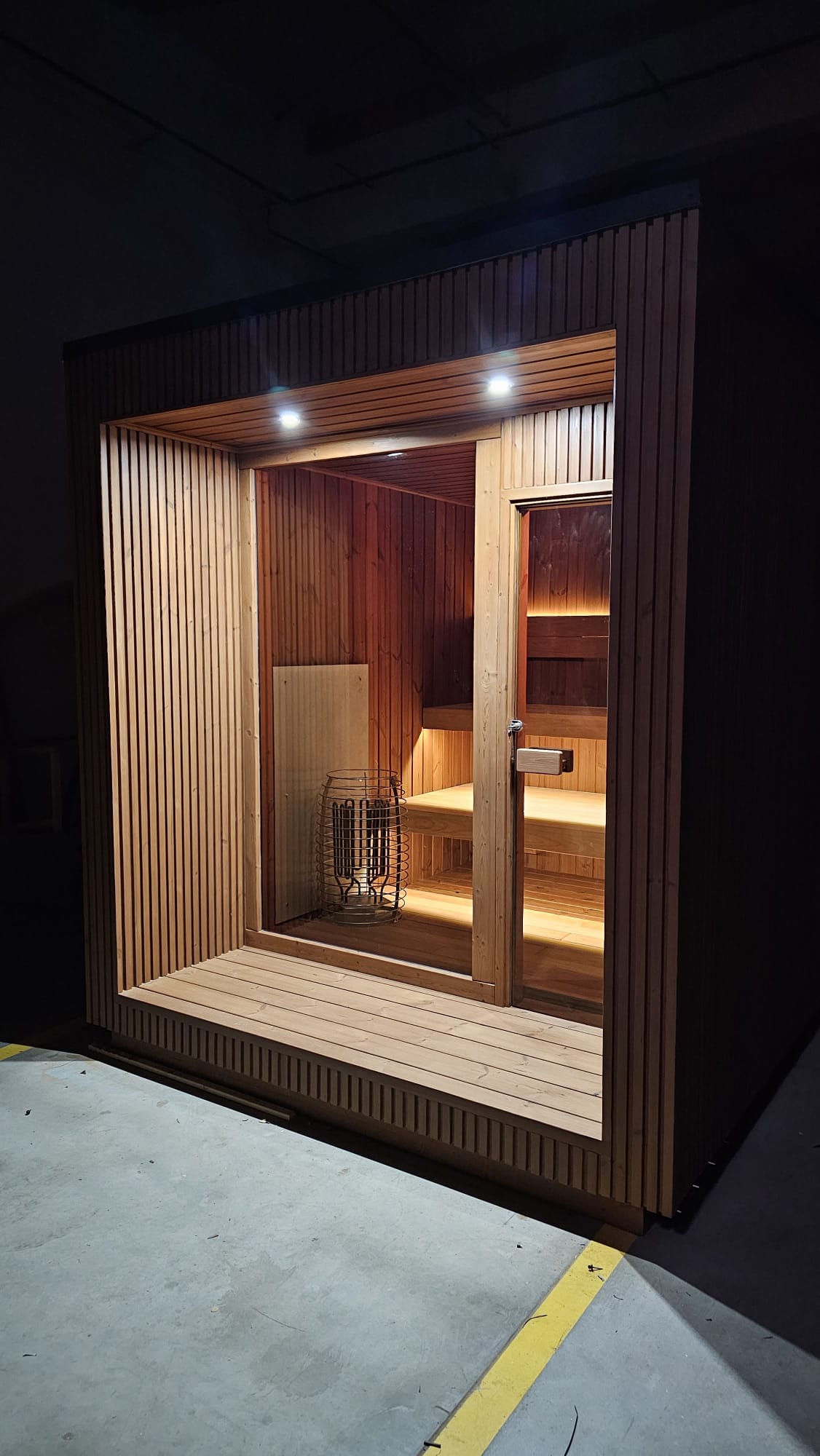 Nasza sauna wyposażona jest w nowoczesne technologie, które podnoszą komfort użytkowania. Oświetlenie w saunie zapewniają dwie lampy, a oświetlenie górne w otwartej strefie relaksu to plafon sterowany pilotem. Skrzynka IP65 z rozdzielnicą i zestawem zabezpieczeń różnicowo-prądowych oraz nadprądowych gwarantuje bezpieczeństwo użytkowania.